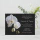 Sigan celebrando a la recién casada y el recién casado la mañana después de su ceremonia de matrimonio con la bonita invitación para Desayuno nupcial de orquídea blanca sobre poste negro. Esta elegante invitación personalizada de flores para Desayuno o Almuerzo después del matrimonio cuenta con una fotografía floral de flores de orquídea phalaenopsis blancas en el tallo con un fondo negro.
