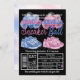 El género de las pelotas de verano revela la invitación con unas hermosas zapatillas de bebé rosas y azules y globos sobre un fondo negro. Simplemente agregue los detalles del evento.
