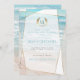 Invitación de Despedida de Soltera | Boda de Playa Geométrica con Monograma Moderno | Una vuelta de tuerca moderna en las invitaciones de boda de playa - Boda Única diseñada para la NoviaDescalza™ por ©WhimsicalArtwork™ que presenta una forma geométrica de estilo terrario descentrado con transparencias variables en las facetas para permitir que el fondo de la playa del océano tropical se muestre a través de una variedad de formas e intensidades. Un enfoque juguetón de la tipografía en el texto - con las iniciales del nombre de la novia y el novio rodeadas por una corona de laurel en la parte superior - en dos colores (turquesa y dorado) - seguido de fuentes serif coordinadas en verde azul grisáceo apagado (recogido del océano) turquesa (recogido de las olas del océano en el fondo) y letras doradas. Los detalles de la boda limpios y simples solo en el anverso de la invitación - un diseño de playa tropical coordinado en el revers