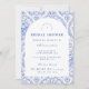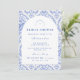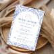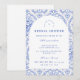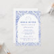 Este elegante diseño de fiesta de regalos de novia presenta un refinado patrón floral vintage en tonos clásicos azul y marfil, inspirado en textiles botánicos tradicionales y estampados de jardín de reliquias familiares. El fondo decorativo combina delicadas flores, rayas y patrones ornamentales que enmarcan una disposición arqueada elegante para los detalles del evento. La paleta de azul atemporal evoca el encanto de la porcelana antigua y las ilustraciones de jardines europeos, creando una estética sofisticada y romántica. Perfecto para fiestas de regalos de novia en el jardín, celebraciones clásicas de bodas o reuniones elegantes de novia con un estilo vintage atemporal.