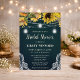 Esta invitación de despedida de soltera rústica presenta girasoles brillantes pintados con acuarela, faroles de frascos de mason brillantes y delicados acentos de encaje sobre un fondo rico en color azul verdoso. Luces suaves de cuerda y tonos cálidos dorados crean una atmósfera acogedora de granja perfecta para celebrar a la novia. Con sus flores alegres, texturas rústicas y brillo acogedor, este diseño trae un ambiente sincero y encantador a cualquier despedida de soltera de verano u otoño.