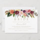 Esta invitación de despedida de soltera con pluma dorada boho tropical es perfecta para una despedida de soltera rústica. El diseño cuenta con plumas marrones silvestres pintadas a mano, flores amarillas boho, blancas, moradas, rosadas, rosadas claras, borgoña y bayas azules ordenadas en hermosos ramos.