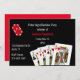 Invitación de despedida de soltero con tema de poker hecha en negro con gráficos de cartas y fichas de póquer. Personalice el texto blanco y rojo personalizado para adaptarlo a las necesidades de su fiesta de póquer.