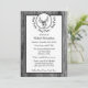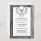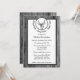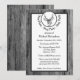 El diseño de la despedida de soltero presenta una fotografía en blanco y negro de tablones de madera rústica de fondo. Hay un rectángulo blanco sólido con borde gris oscuro con texto personalizable en letra negra. En la parte superior hay un círculo blanco con borde gris oscuro. En el centro hay un dibujo a lápiz en blanco y negro de una cabeza de ciervo. Alrededor del círculo hay un texto que dice Stag Party. Stag Party. Stag. Stag Party. La parte posterior de la invitación tiene la misma fotografía de madera en blanco y negro. Esta es la invitación perfecta para tu despedida de soltero.