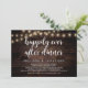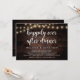 Hermosa celebración de fiesta Felices para Siempre, anuncio de huida de novios / tarjeta de invitación, en diseño de madera de granja rústica, luces de cuerda. Esto es perfecto para la recepción de su boda y la fiesta de celebración después de la boda. Agregue sus detalles en la fuente / letra coincidente.