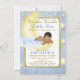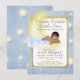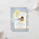 Invitación de baby shower de Niños Brilla, brilla pequeña estrella con adorable bebé étnico en una hermosa luna amarilla con nubes suaves sosteniendo una estrella amarilla brillante en un bonito fondo de estrellas azules y amarillas con foil azul y dorado. Puede personalizar fácilmente esta hermosa invitación de baby shower de brilla, brilla pequeña estrella para su evento simplemente agregando sus detalles en el estilo de fuente que elija. Este es un diseño impreso sin foil real, purpurina, etc.