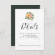 Tarjeta de detalles de boda rústica chic en naranjal botánico de cítricos. Características de la fruta cítrica naranja, vegetación del huerto y arreglo floral blanco. Líneas de texto de plantilla para su información detallada. Color de fondo en verde oscuro cazador coordinado.