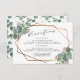 Esta es una hermosa tarjeta de detalles de boda que presenta un diseño de marco geométrico con eucalipto y dorado. Se incluye un fondo coincidente con patrón de hojas de eucalipto.