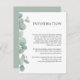 Un hermoso borde de vegetación de eucalipto en acuarela destaca esta moderna tarjeta de información de boda utilizada para proporcionar a sus invitados de boda detalles, alojamiento de hotel, su sitio web de boda u otra información útil en torno a su boda. Personalice el texto de muestra que se muestra en la plantilla de texto con los detalles deseados. Estas tarjetas pueden enviarse como un anexo con sus invitaciones de boda. Una suite de productos de papelería a juego está disponible en este diseño para coordinar su boda o evento con un estilo hermoso.