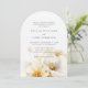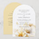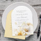 Elegante y romántico ramo grande de acuarela de flores blancas amarillas y doradas en la parte inferior de la invitación de boda con detalles de la boda en el reverso.