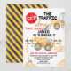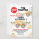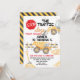 Invitación de cumpleaños con tema de construcción para niños con un camión de volteo, escalera, tierra y señal de stop roja. Puede ser utilizada para cualquier edad e ideal para una fiesta de cumpleaños con tema de construcción para niños.