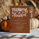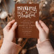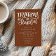 Celebremos el espíritu de gratitud de este Día de Acción de Gracias con esta cena "Agradecida y agradecida". Con un acogedor fondo marrón con un guión encantador y delicados acentos otoñales, esta invitación marca el tono perfecto para una sincera cena de Acción de Gracias. Invite a la familia y a los amigos a unirse a usted para darle las gracias con este diseño elegante y festivo.