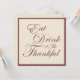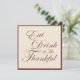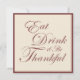 Esta elegante y moderna tipografía invitación de Acción de Gracias para su cena fiesta o almuerzo, en colores otoñales de crudo y castaño lecturas Coma beber y sé agradecido. Hay un sobre y un franqueo coincidentes.