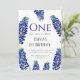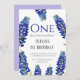 Flores azules de Texas acuden a la acuarela invitaciones a la fiesta de cumpleaños 1. Redes de color azul pintadas a mano por mí mismo. Personalízalo con tus detalles.