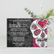 Hermoso diseño de mandala blanca y negra con acentos de purpurina rojo rubí detrás de una henna adornado con el cráneo azucarero de Dia de los Muertos. Personalizable fácilmente a la información de su boda. Anuncie su celebración matrimonial con orgullo y gusto.