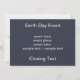 Esto se puede usar para invitar a participar en un proyecto de limpieza de vecindarios, una manifestación por la legislación ambiental u otro evento relacionado con el Día de la Tierra. Una representación alegórica de los peligros del cambio climático. Presenta una línea de huellas, "huellas de carbono", que se han derretido a través del paquete de hielo polar. El "Día de la Tierra" se representa como hielo separatista; "Huellas de Carbono" como cenizas o hollín; tal vez gotas de petróleo. Por favor, camina a la ligera en la Tierra.