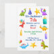Dinosaurios divertidos en colores primarios decoran esta invitación de cumpleaños