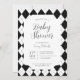 Clásica y atemporal invitación de bebé en negro y blanco con patrón argyle. Estilos de fuente y diseño personalizables, que presentan un fondo con un patrón simple y formas de diamante geométricas limpias. Perfecta para invitaciones de baby shower unisex, invitaciones de baby shower para niños y invitaciones de baby shower con estilo preppy.