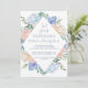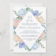 Esta tarjeta de invitación de aniversario de bodas de 50 años con diamantes florales azules polvorientos es perfecta para una fiesta de aniversario de primavera o verano. El delicado diseño presenta peonías azul claro dispuestas con flores de durazno y crema en una hermosa corona en forma de diamante.