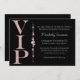 Esta invitación de fiesta personalizada presenta un tema glamuroso y elegante en un fondo negro. El título de VIP está impreso en un diseño de brillo rosa suave a la izquierda. Una banda de diamantes rosas separa el área de texto. Es perfecto para una fiesta de cumpleaños, despedida de soltera u otra celebración fabulosa.