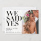 Este anuncio de boda chic en blanco y negro es una excelente manera de hacer saber a tus amigos y familiares que te has escapado, has tenido una ceremonia secreta o boda privada, y deseas celebrarlo con ellos. La parte frontal de la tarjeta está diseñada para mostrar tu foto favorita en orientación vertical, con las palabras "We Said Yes" a la izquierda en una tipografía de revista de moda atemporal y elegante en negro. Tus nombres, fecha de la boda y ubicación aparecen en la parte inferior izquierda en una fuente moderna sans serif de moda, y tu foto de boda vertical a la derecha. La parte trasera de la tarjeta te permite escribir información personalizada de la boda, así como incluir la información de la invitación a la recepción, y cuenta con una foto enmarcada en blanco y negro en orientación vertical/retrato. Este es un diseño de plantilla, y es muy fácil de personalizar según tus necesidades. Muchas gracias por apoyar nuestro pequeño negocio, lo apreciamos mucho.
