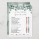Un juego popular para una ducha de novia. Dijo, dijo o a veces se llama "adivina quién lo dijo". Se trata de un lugar fresco con un fondo blanco. El rociado de hojas de eucalipto en la parte superior añade un agradable toque de color mudo. Todas las oraciones son editables, así que cámbielas específicas para tu pareja que pronto se casará. Se puede utilizar para una ducha de matrimonio o una ducha para parejas. Sus invitados girarán el icono correcto dependiendo de su respuesta. Un juego divertido, que todos pueden jugar.