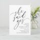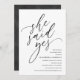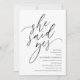 Esta invitación a la fiesta de compromiso incluye la frase "Ella dijo sí" en un moderno guión escrito a mano en negro con detalles fiestas debajo y un fondo de color negro de agua en la parte posterior.