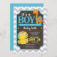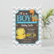 It's a Boy! Invitación a la ducha de bebé de dinosaurio azul, Naranja y amarillo. Fondo de patrón de chevron gris y blanco.