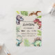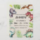 A cute dinosaur-themed kids birthday invitation, soft watercolor illustration style. Beige/cream background with tropical green leaves (monstera, palm, jungle foliage) arranged around the edges as a frame. Adorable friendly dinosaurs in watercolor: a purple triceratops, a flying pterodactyl, a smiling red T-rex, a blue long-neck dinosaur, and a green stegosaurus, all evenly spaced around the border. Playful, child-friendly look with soft shading and pastel colors.