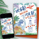 Invitación de cumpleaños de dinosaurio para el cuarto cumpleaños de un niño. La frase de la rima dice "Roar [nombre] está convirtiendo a cuatro". Diseño de dino acuarela con lindos dinosaurios en un entorno de jungla tropical y ajardinada. Por favor, navegue por mi tienda para más invitaciones de cumpleaños de dinosaurios.