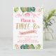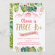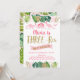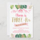 Esta encantadora invitación para el cumpleaños incluye hojas de acuarela tropical con adornos de hojas de purpurina dorado y dinosaurios rosas.