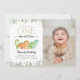 Invite a los amigos y a la familia con estilo y establezca el tono de su día especial con esta encantadora invitación de cumpleaños. El diseño incluye dinosaurios (brontosauro, estegosaurio, triceratops, tyrannosaurus rex) y vegetación sobre fondo blanco.