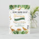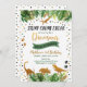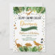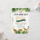 Esta adorable invitación de cumpleaños incluye hojas de acuarela tropical con adornos de hojas de Relieve metalizado dorado y siluetas de dinosaurios dorados.