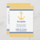 Tarjeta de recepción de boda con tema de ancla náutica amarilla y azul marino con direcciones.