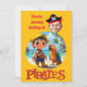 ¡Un juego perfecto para divertirse en cumpleaños! Este alegre diseño presenta a su hijo como un pirata personalizado, parado en una playa con palmeras, un loro y un tesoro a la vista. Inserta su propia foto y texto.