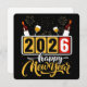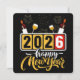 Diseño festivo de "Feliz Año Nuevo 2026" con fuegos artificiales, botellas de vino, copas de champán y un audaz calendario con fecha cambiante. Perfecto para recibir el año nuevo con estilo.