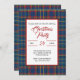 inspiradas en los tartanes escoceses vintage, las rayas son de rayas rojas, turquesas, amarillas, verdes de la botella en una impresión de fondo azul oscuro en todo el edificio. Disfruta de esta clásica invitación de fiesta, cada sección se puede editar para los detalles de tu fiesta.