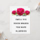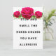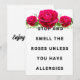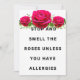 **Diseño frontal:** Una pantalla vibrante y elegante de rosas rojas exuberantes en plena floración, sus pétalos ricos en matices de piel profundos. Las delicadas hojas verdes proporcionan el contraste perfecto, haciendo el ramo pop. **Texto en la tarjeta:** *Detener y oler a los Rosas a menos que tengas alergias. Escrito en una letra juguetona y elegante que añade un toque humorístico a la belleza de los rosas. (Opcional):** Un mensaje desenfadado que continúa la diversión, como *"Si tienes alergias, bueno... ¡al menos están bonitos a mirar!"* Esto se puede escribir a mano o agregar cualquier otro mensaje si deseas dentro de esta tarjeta.