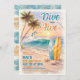 Breeze into birthday fun with this “Dive into Five” retro surf beach invitation — perfect for an ocean-loving kid turning five! This hand-painted watercolor design captures a dreamy tropical shoreline at sunset, featuring surfboards in the sand, seashells, ocean waves, palm trees, a playful dolphin leaping through the surf, and a seagull gliding overhead. The vibrant turquoise and burnt orange palette brings all the laid-back charm of a vintage seaside hangout.