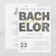 Esta tarjeta encarna perfectamente el espíritu de una despedida de soltero. La tipografía divertida de brillo negro y los acentos dorados son modernos, divertidos y establecen el tono adecuado para un fin de semana lleno de diversión. Simplemente actualice esta tarjeta con los detalles de su fiesta y prepárese para celebrar.