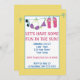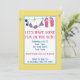 Esta invitación de cumpleaños fiesta a la piscina incluye un par de gafas de sol, un traje de baño y chanclas colgadas en una línea y campos de texto de personalizable.