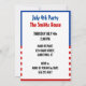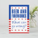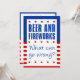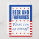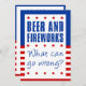 Cerveza y fuegos artificiales - ¿Qué puede salir mal? Invitación divertida para una fiesta del 4 de julio. Una invitación graciosa para una fiesta del Día de la Independencia con alcohol y fuegos artificiales. Colores rojo, blanco y azul.