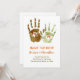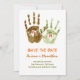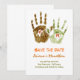 dos sellos de manos con las letras del nombre de la novia y el novio. Diseño original y divertido para anuncios de salvar la fecha.