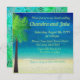 Esta es una invitación de boda divertida y festiva con un fondo soñador de océano azul acuático con arenas brillantes de la playa. Un solitario árbol de palma aparece en un lado de la tarjeta y la parte posterior tiene tonos vibrantes de follaje tropical. Vibraciones casuales de diversión en el sol