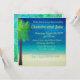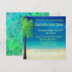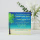 Esta es una invitación de boda divertida y festiva con un fondo soñador de océano azul acuático que incluye arenas brillantes de la playa. Un solitario árbol de palma aparece en un lado de la tarjeta y la parte posterior tiene tonos vibrantes de follaje tropical. Diversión casual en las vibras del sol