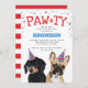 Las invitaciones para fiestas de cumpleaños de perros con un bulldog francés y un dachshund, ambos con gorras fiestas, confetti rojo y azul, la palabra "PAW-TY" y una plantilla de fiesta mascota simple.