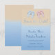 Un anuncio divertido y moderno de boda de Guarde la Fecha que tiene un ambiente relajado de resort de playa. La arena simulada y el oleaje proporcionan el fondo a hermosas sandalias azules y rosadas en la parte superior de la tarjeta.
