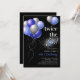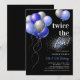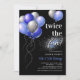 Invitaciones conjuntas de cumpleaños azules y plateadas con un fondo negro elegante, globos de fiesta brillantes y una plantilla de texto "doble diversión" que es fácil de personalizar.