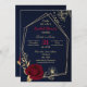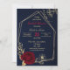 flores burdeos románticas elegantes y hojas de oro sobre marco geométrico oro lujo invitación de ducha de novia azul marino Los detalles purpurinas se simulan