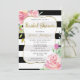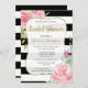 Estas elegantes invitaciones a la ducha de matrimonio cuentan con modernas rayas blancas y negras con hermosos rosas acuáticos y flores que evocan un ambiente de época bonito. El texto está enmarcado con un falso Relieve metalizado dorado con un fondo blanco. El texto "Bridal Shower" también se hace en un estilo de Relieve metalizado de oro falso bonito. La combinación perfecta entre lo moderno y lo tradicional. A amigos y familiares les encantará la elegancia simple y moderna de esta tarjeta. Se trata de un lugar especialmente lujoso, con las opciones de papel de "soporte" y "Luxe Pearl Shimmer". Ver mi tienda para coordinar artículos (¡y contactarme si necesitas algo más creado para coordinar!) ©2016 Bodas*n*Whimsy